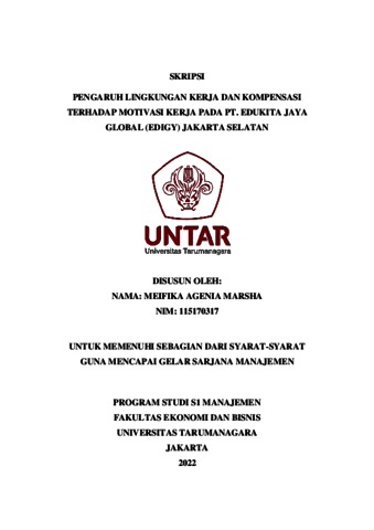 MARSHA, MEIFIKA AGENIA (2022) PENGARUH LINGKUNGAN KERJA DAN KOMPENSASI TERHADAP MOTIVASI KERJA PADA PT. EDUKITA JAYA GLOBAL (EDIGY) JAKARTA SELATAN. Skripsi thesis, Universitas Tarumanagara.