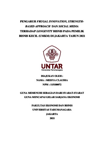 CLAUDIA, MEISYA (2022) PENGARUH FRUGAL INNOVATION, STRENGTH-BASED APPROACH DAN SOCIAL MEDIA TERHADAP LONGEVITY BISNIS PADA PEMILIK BISNIS KECIL (UMKM) DI JAKARTA TAHUN 2021. Skripsi thesis, Universitas Tarumanagara.