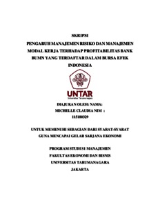 CLAUDIA, MICHELLE (2021) PENGARUH MANAJEMEN RISIKO DAN MANAJEMEN MODAL KERJA TERHADAP PROFITABILITAS BANK BUMN YANG TERDAFTAR DALAM BURSA EFEK INDONESIA. Skripsi thesis, Universitas Tarumanagara.