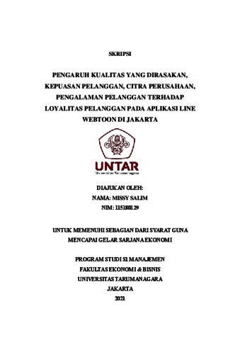 SALIM, MISSY (2022) PENGARUH KUALITAS YANG DIRASAKAN, KEPUASAN PELANGGAN, CITRA PERUSAHAAN, PENGALAMAN PELANGGAN TERHADAP LOYALITAS PELANGGAN PADA APLIKASI LINE WEBTOON DI JAKARTA. Skripsi thesis, Universitas Tarumanagara.