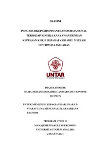 NASUTION, MUHAMMAD SAHRUL ANWAR (2022) PENGARUHKEPEMIMPINANTRANSFORMASIONALTERHADAP KINERJA KARYAWAN DENGAN KEPUASAN KERJA SEBAGAI VARIABEL MEDIASI DI PT DWIJAYA SELARAS. Skripsi thesis, Universitas Tarumanagara.