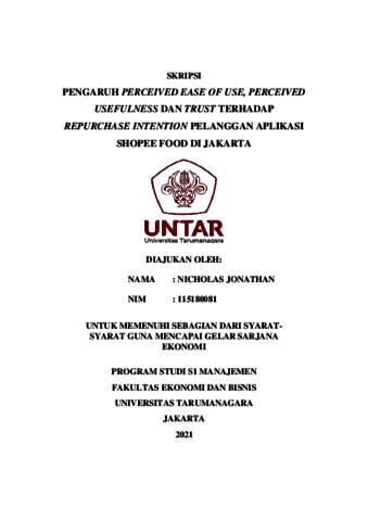 JONATHAN, NICHOLAS (2022) PENGARUH PERCEIVED EASE OF USE, PERCEIVED USEFULNESS DAN TRUST TERHADAP REPURCHASE INTENTION PELANGGAN APLIKASI SHOPEE FOOD DI JAKARTA. Skripsi thesis, Universitas Tarumanagara.
