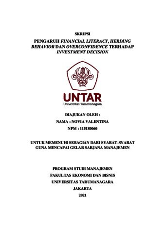 VALENTINA, NOVIA (2022) PENGARUH FINANCIAL LITERACY, HERDING BEHAVIOR DAN OVERCONFIDENCE TERHADAP INVESTMENT DECISION. Skripsi thesis, Universitas Tarumanagara.