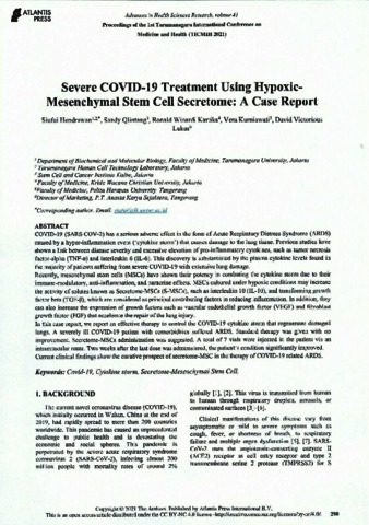 Siufui Hendrawan, prossiding and Sandy Qlintang, prossiding and Ronald Winardi Kartika, prossiding and Vera Kurniawati, prossiding and David Victorious Lukas, prossiding (2021) Severe COVID-19 Treatment Using Hypoxic-Mesenchymal Stem Cell Secretome: A Case Report. Proceedings of the lst Tarumanagara International Conference on Medicine and Health (TICMIH 2021), 4 (-). pp. 290-295. ISSN 978-94-6239-473-5, 2468-5739