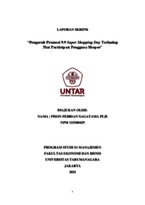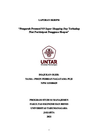 PUJI, PISON FEBRIAN NAGATAMA (2022) Pengaruh Promosi 9.9 Super Shopping Day Terhadap Niat Paritisipasi Pengguna Shopee. Skripsi thesis, Universitas Tarumanagara.