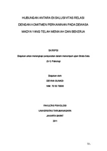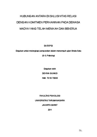 Gunadi, Devina (2022) Hubungan antara Eksklusivitas Relasi dengan Komitmen Perkawinan pada Dewasa Madya yang telah Menikah dan Bekerja. Skripsi thesis, Universitas Tarumanagara.