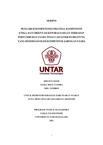CANDRA, RICO (2021) PENGARUH KOMPETENSI STRATEGI, KOMPETENSI ETIKA, DAN ORIENTASI KEWIRAUSAHAAN TERHADAP PERTUMBUHAN USAHA WISATA KULINER DI BELITUNG YANG DIMEDIASI OLEH KOMPETENSI JARINGAN USAHA. Skripsi thesis, Universitas Tarumanagara.