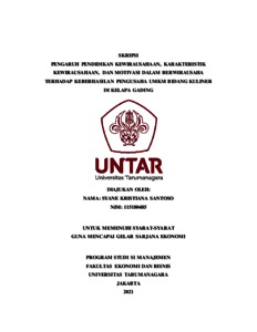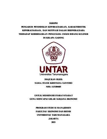 SANTOSO, SYANE KRISTIANA (2022) PENGARUH PENDIDIKAN KEWIRAUSAHAAN, KARAKTERISTIK KEWIRAUSAHAAN, DAN MOTIVASI DALAM BERWIRAUSAHA TERHADAP KEBERHASILAN PENGUSAHA UMKM BIDANG KULINER DI KELAPA GADING. Skripsi thesis, Universitas Tarumanagara.