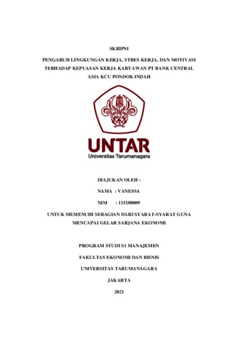VANESSA, VANESSA (2022) PENGARUH LINGKUNGAN KERJA, STRES KERJA, DAN MOTIVASI TERHADAP KEPUASAN KERJA KARYAWAN PT BANK CENTRAL ASIA KCU PONDOK INDAH. Skripsi thesis, Universitas Tarumanagara.