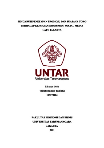 Tanjung, Vicsel Imanuel (2022) PENGARUH PENETAPAN PROMOSI, DAN SUASANA TOKO TERHADAP KEPUASAN KONSUMEN SOCIAL MEDIA CAFE JAKARTA. Skripsi thesis, Universitas Tarumanagara.
