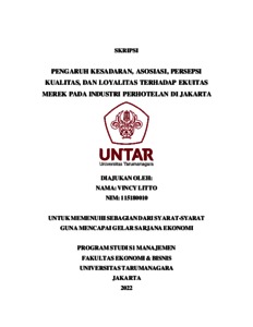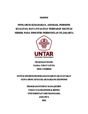 LITTO, VINCY (2022) PENGARUH KESADARAN, ASOSIASI, PERSEPSI KUALITAS, DAN LOYALITAS TERHADAP EKUITAS MEREK PADA INDUSTRI PERHOTELAN DI JAKARTA. Skripsi thesis, Universitas Tarumanagara.