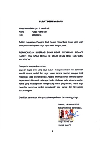 virtual, keberadaan media sosial juga menjadi celah untuk melihat dan merasakan tuntutan sosial hingga membandingkan pencapaian diri sendiri dengan orang lain. Pengguna media sosial ini didominasi oleh kalangan dengan rentang usia yang tergolong dalam fase emerging adulthood. Fase ini adalah masa eksplorasi diri seseorang maupun lingkungan sekitarnya, dalam fase ini juga mencuatlah permasalahan baru serta tanggung jawab yang lebih besar juga. Hal inilah yang mungkin dapat menimbulkan terjadinya quarter-life crisis yang dapat memunculkan perasaan atau emosi yang negatif. Perasaan negative itu bisa saja berkembang menjadi depresi, sehingga krisis ini tidak dapat diabaikan begitu saja. Salah satu cara yang dapat dilakukan adalah mencoba untuk mengembangkan diri dengan membaca buku self-improvement. Buku “Hidup Antigalau: Menata Karier dan Masa Depan di Umur 20-an “ ini dapat menjadi alternatifnya, tetapi tampilan buku ini yang berupa full text dapat membuat sebagian pembacanya merasa jenuh, mata terasa lelah, hingga hilangnya minat untuk membaca buku ini. Selain itu, buku pesaing sejenisnya juga memiliki visual berupa ilustrasi di dalam bukunya, dan hal ini menghasilkan respon yang positif serta apresiasi terhadap ilustrasi dalam buku tersebut. Apalagi sebagian orang juga memiliki gaya belajar visual yang lebih menonjolkan kepada media-media yang berfokus pada pengelihatan. Maka itu, perancangan ilustrasi pada buku “Hidup Antigalau: Menata Karier dan Masa Depan di Umur 20-an“ bertujuan untuk menarik perhatian dan membantu memperjelas informasi dalam buku. Metode untuk perancangan ini adalah Design Thinking. Selain itu, ilustrasi kartun dan penggunaan warna yang berbeda untuk setiap bab menjadi keputusan untuk menyampaikan kesan menyenangkan dalam perancangan, dan kesan dinamis disampaikan melalui ekperimen permain tipografi dalam layout buku. Warna young adult, intiutif, dan netral dipakai dalam perancangan ini karena warna tersebut sesuai dengan usia kalangan di fase emerging adulthood dan memberikan mood ringan serta energik. Font family Helvetica Neue digunakan untuk melengkapi perancangan ini, serta layout buku yang diterapkan adalah sebagian teks dan ilustrasi diletakkan terpisah pada halaman yang berbeda dan sebagian ilustrasinya diletakkan bersama dengan teks di halaman yang sama. Adapun, ukuran isi bukunya yaitu 14x21 cm dan dijilid hardcover, yang memuat 224 halaman atau 56 lembar termasuk bagian cover-nya. Pada bagian isi buku digunakan kertas HVS 100 gsm dan untuk cover-nya menggunakan hardcover board yang dilapisi art paper 150 gsm. Kata Kunci: Buku Ilustrasi, Kartun, Perancangan, Self-Improvement