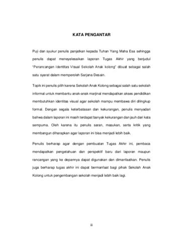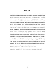 Tidak semua individu berkesempatan mengenyam pendidikan karena kendala ekonomi. Kondisi ini memancing masyarakat umum mendirikan sekolah informal untuk anak marjinal, salah satunya adalah Sekolah Anak Kolong. Dalam memperkenalkan sekolah, dibutuhkan berbagai macam identitas, salah satunya melalui identitas visual sebagai lambang dan citra untuk Sekolah Anak Kolong. Penelitian ini bertujuan untuk merancang identitas visual untuk Sekolah Anak Kolong yang melambangkan visi misi dan tujuan dari berdirinya sekolah. Metode perancangan yang digunakan sebagai landasan adalah metode perancangan menurut Robin Landa. Subjek penelitian adalah Sekolah Anak Kolong. Data dikumpulkan melalui observasi, wawancara, studi pustaka, dan dianalisis secara deskriptif. Dalam perancangan menggunakan konsep kreatif dengan menemukan kata kunci sekolah sebagai naungan, sumber keceriaan dan cita-cita. Menggunakan pemilihan warna terang dan ceria, tipografi jenis sans-serif yang membawa kesan tidak kaku. Kata kunci: Sekolah Anak Kolong, informal, non-profit, Identitas visual,