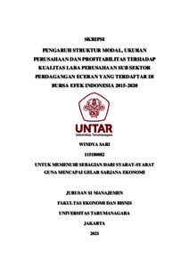 SARI, WINDYA (2022) PENGARUH STRUKTUR MODAL, UKURAN PERUSAHAAN DAN PROFITABILITAS TERHADAP KUALITAS LABA PERUSAHAAN SUB SEKTOR PERDAGANGAN ECERAN YANG TERDAFTAR DI BURSA EFEK INDONESIA 2015-2020. Skripsi thesis, Universitas Tarumanagara.