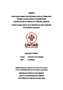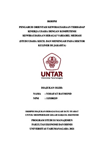 RAYMOND, YOSAFAT (2022) PENGARUH ORIENTASI KEWIRAUSAHAAN TERHADAP KINERJA USAHA DENGAN KOMPETENSI KEWIRAUSAHAAN SEBAGAI VARIABEL MEDIASI (STUDI USAHA KECIL DAN MENENGAH PADA SEKTOR KULINER DI JAKARTA). Skripsi thesis, Universitas Tarumanagara.