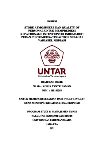 SAMAN, YOSUA TANTRI (2022) STORE ATMOSPHERE DAN QUALITY OF PERSONAL UNTUK MEMPREDIKSI REPATRONAGE INTENTIONS DI INDOMARET: PERAN CUSTOMER SATISFACTION SEBAGAI VARIABEL MEDIASI. Skripsi thesis, Universitas Tarumanagara.