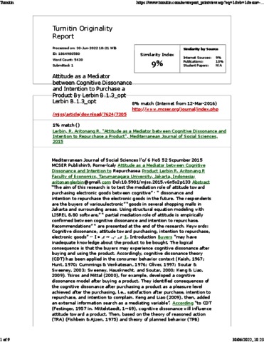 Lerbin R. Aritonang, Turnitin (2015) Turnitin Attitude As A Mediator Between Cognitive Dissonance And Intention To Repurchase a product. Attitude As A Mediator Between Cognitive Dissonance And Intention To Repurchase a product, 6 (3). pp. 133-141. ISSN 2039