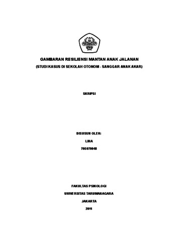 Lina, Lina (2022) Gambaran Resiliensi Mantan Anak Jalanan (Studi Kasus di Sekolah Otonom – Sanggar Anak Akar). Skripsi thesis, Universitas Tarumanagara.