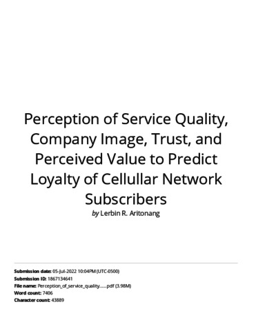 Lerbin R. Aritonang, Turnitin (2013) Turnitin " Perception On Service Quality, Company Image, Trust, And Perceived Value To Predict Loyalty Of Cellular Network Subcribers ". " Perception On Service Quality, Company Image, Trust, And Perceived Value To Predict Loyalty Of Cellular Network Subcribers ", 1 (20). ISSN 2309-379X