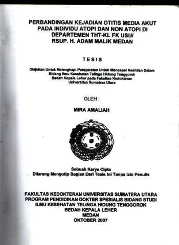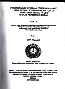 Amaliah, Mira (2007) Perbandingan Kejadian Otitis Media Akut pada Individu Atopi dan Non Atopi di Departemen THT-KL FK USU/RSUP. H. Adam Malik Medan. Masters thesis, Universitas Sumatera Utara.