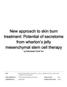 Tan, Sukmawati Tansil (2020) Turnitin "New approach to skin burn treatment Potential of secretome from wharton’s jelly mesenchymal stem cell therapy". International Journal of Advanced Biochemistry Research, 4 (2). ISSN ISSN Print: 2617-4693 ; ISSN Online: 2617-4707 (Unpublished)