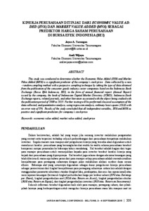 Turangan, Joyce A and Wijaya, Andi (2015) KINERJA PERUSAHAAN DITINJAU DARI ECONOMIC VALUE ADDED (EVA) DAN MARKET VALUE ADDED (MVA) SEBAGAI PREDIKTOR HARGA SAHAM PERUSAHAAN DI BURSA EFEK INDONESIA (BEI). Karya Ilmiah Dosen. pp. 335-348.
