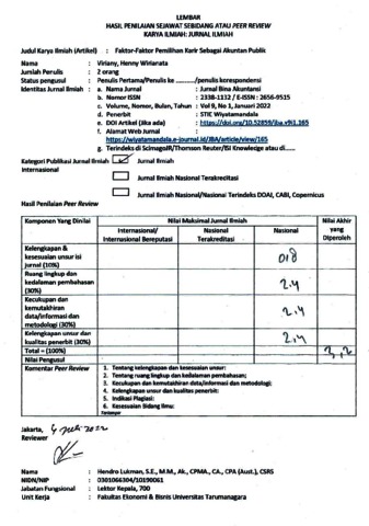 Henny Wirianata, Review (2022) Review Faktor-faktor pemilihan karir sebagai akuntan publik. Faktor-faktor pemilihan karir sebagai akuntan publik, 9 (1). pp. 1-21. ISSN 2338-1132 / 2656-9515
