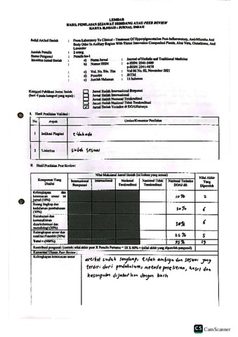 Tan, Sukmawati Tansil Peer Review + reviewer “From Laboratory To Clinical - Treatment Of Hyperpigmentation Post-Inflammatory, Anti-Microba And Body Odor In Axillary Region With Tissue Innovation Composited Pionin, Aloe Vera, Glutathione, And Lavender“. Journal of Holistic and Traditional Medicine. ISSN e-ISSN: 2541-5409 ; p-ISSN: 2541-4178 (Unpublished)