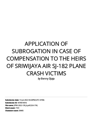 Djaja, Benny (2022) Turnitin : Application of Subrogation in Case of Compensation to The Heirs of Sriwijaya Air SJ-182 Plane Crash Victims. Journal of Positive Psychology & Wellbeing. ISSN 2587-0130