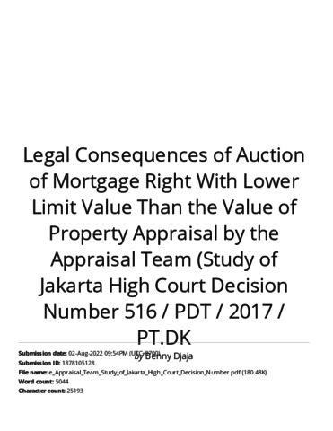 Legal Consequences of Auction of Mortgage Right With Lower Limit Value Than the Value of Property Appraisal by the Appraisal Team (Study of Jakarta High Court Decision Number 516 _ PDT _ 2017 _ PT.DK.pdf Download (2MB) | Preview |