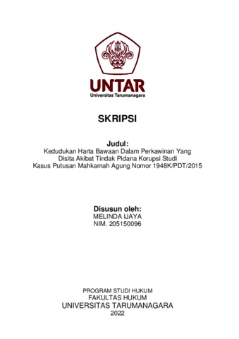 Ijaya, Melinda (2022) Kedudukan harta bawaan dalam perkawinan yang disita akibat tindak pidana korupsi Studi kasus putusan Mahkamah Agung Nomor 1948 K/PDT/2015. Skripsi thesis, Universitas Tarumanagara.