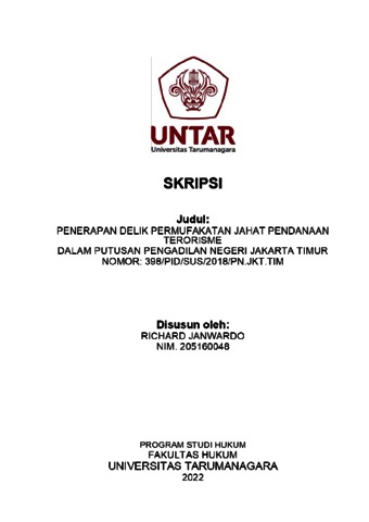 Janwardo, Richard (2022) Penerapan delik permufakatan jahat pendanaan terorisme dalam putusan Pengadilan Negeri Jakarta Timur Nomor : 398/Pid/Sus/2018/PN.Jkt.Tim. Skripsi thesis, Universitas Tarumanagara.