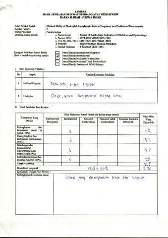 Dewi, Andriana Kumala Peer Review + reviewer “Clinical Ability of Neutrophil–Lymphocyte Ratio in Pregnancy as a Predictor of Preeclampsia“. Journal of South Asian Federation of Obstetrics and Gynaecology. ISSN 0974-8938 (print) ; 0975-1920 (e-print) (Unpublished)