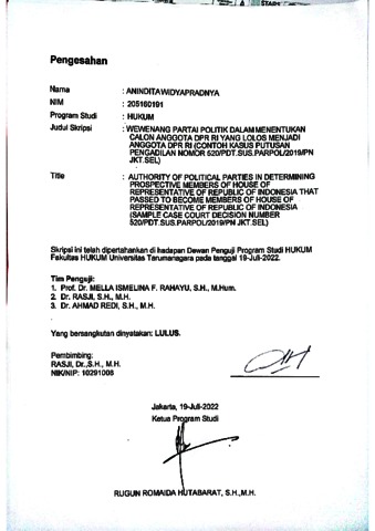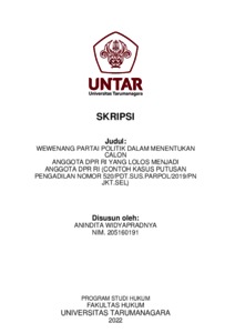 Widyapradnya, Anindita (2022) Wewenang Partai Politik Dalam Menentukan Calon Anggota DPR RI yang Lolos Menjadi Anggota DPR RI (Contoh Kasus Putusan Pengadilan Nomor 520/PDT.SUS/PARPOL/2019/PN.JKT.SEL). Skripsi thesis, Universitas Tarumanagara.