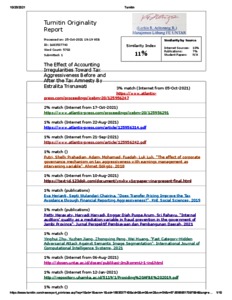Elizabeth Sugiarto D, Turnitin (2020) Turnitin The Effect of Accounting Irregularities Toward Tax Aggressiveness Before and After the Tax Amnesty. The Effect of Accounting Irregularities Toward Tax Aggressiveness Before and After the Tax Amnesty. ISSN ISSN : 2352-5428 / ISBN : 978-94-6239-375-2