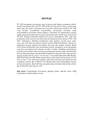 PT. XYZ merupakan perusahaan yang bergerak pada bidang pembuatan akrilik. Akrilik yang ditawarkan oleh PT. XYZ terdiri dari tiga jenis warna, yaitu bening, putih susu, dan hitam. Permintaan dan lead time bahan baku akrilik di PT. XYZ yang bersifat probabilistik menyebabkan perusahaan kesulitan untuk mengendalikan persediaan bahan bakunya. Penelitian ini dilaksanakan dengan tujuan untuk menentukan ukuran pemesanan bahan baku akrilik yang ekonomis di PT XYZ. Tahapan penelitian dimulai dari proses pengumpulan data, yaitu data permintaan, data lead time dan data biaya persediaan periode Agustus 2020 – Juli 2021. Selanjutnya, dilakukan perhitungan order quantity, reorder point, safety stock, dan total biaya persediaan dengan metode EOQ Probabilistik. Setelah itu, dilanjutkan dengan simulasi permintaan dan lead time dengan simulasi Monte Carlo untuk memprediksi data permintaan periode selanjutnya serta menghitung total biaya persediaan hasil simulasi tersebut. Terakhir, dilakukan perbandingan total biaya persediaan antara metode perusahaan dan metode usulan. Berdasarkan hasil perhitungan dengan metode EOQ Probabilistik, diperoleh nilai order quantity masing-masing sebesar 34 ton, 5.4 ton, dan 7.3 ton untuk bahan baku ARC Bening, ARC Putih Susu, dan ARC Hitam dengan nilai reorder point masing-masing 21 ton, 0.9 ton, dan 1.5 ton. Dari hasil simulasi, diperoleh total biaya persediaan periode selanjutnya sebesar Rp 19.400.673.130. Berdasarkan hasil perbandingan dengan metode perusahaan, diperoleh biaya penghematan persediaan bahan baku sebesar Rp 310.941.861 atau sebesar 1.6%. Kata kunci: Pengendalian Persediaan, Quantity Order, Reorder Point, EOQ Probabilistik, Simulasi Monte Carlo