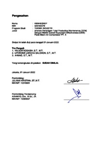 Kenheskey, Kenheskey (2022) Analisis penerapan total productive maintenance (tpm) dengan metrik overall equipment effectiveness (oee) pada mesin air compressor pt.x (T. Ind - 732). Skripsi thesis, Universitas Tarumanagara.