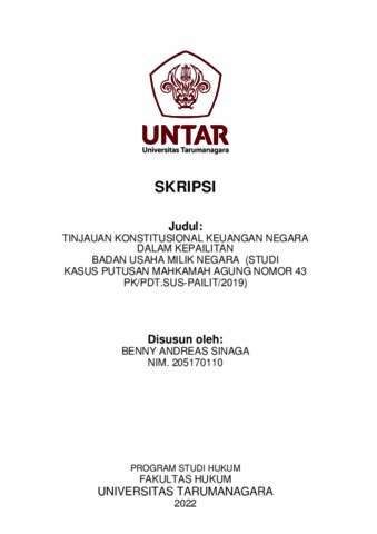 SINAGA, BENNY ANDREAS (2022) TINJAUAN KONSTITUSIONAL KEUANGAN NEGARA DALAM KEPAILITAN BADAN USAHA MILIK NEGARA (STUDI KASUS PUTUSAN MAHKAMAH AGUNG NOMOR 43 PK/PDT.SUS-PAILIT/2019). Skripsi thesis, Universitas Tarumanagara.