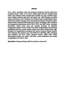 Front splitter merupakan salah satu komponen kendaraan bermotor khususnya kendaraan beroda empat. Front splitter adalah bagian eksterior tambahan pada mobil yang berfungsi untuk mempercantik tampilan dan juga memiliki fungsi utama sebagai pemecah angin dari arah depan agar tidak langsung menabrak bagian body bawah mobil. Penelitian ini bertujuan untuk membandingkan faktor keamanan, keluluhan, tegangan geser,serta pergeseran dimensi antara front splitter dengan bahan komposit bambu dengan front splitter berbabahan ABS. Penelitian ini menggunakan pembebanan sebesar 300 N, 350 N, dan 400ON beban ini didapat berdasarkan sumber jurnal yang ada. Simulasi penelitian ini dilakukan menggunakan aplikasi Fusion Autodesk 360 untuk menggumpulkan data dari hasil pembebanan pada front spliter bambu maupun front splitter dengan bahan ABS. Penelitian ini menghasilkan kesimpulan front splitter komposit bambu memiliki nilai keamanan dan tegangan geser yang lebih besar dibanding ABS, sedangkan nilai nilai keluluhan dari front splitter komposit bambu sedikit lebih rendah dibandingkan dengan front splitter ABS pada semua pembebanan dan mampu menggantikan front splitter ABS. Kata Kunci : Komposit Bambu,ABS,Front Splitter, Fusion 360