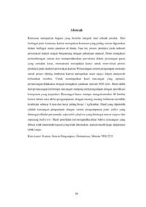 Kemasan merupakan bagian yang bersifat integral dari sebuah produk. Dari berbagai jenis kemasan, karton merupakan kemasan yang paling umum digunakan dalam berbagai rantai pasokan di dunia. Saat ini, proses produksi pada industri percetakan karton sangat bergantung dengan pekerjaan manual. Demi mengikuti perkembangan zaman dan mempertahankan prevalensi dalam persaingan pasar yang semakin ketat, otomatisasi merupakan kunci untuk merevolusi proses produksi pada insdutri percetakan karton. Perancangan sistem pengumpan otomatis untuk proses slitting lembaran karton merupakan suatu upaya dalam menjawab kebutuhan tersebut. Untuk mendapatkan hasil rancangan yang optimal, perancangan dilakukan dengan mengikuti panduan metode VDI 2221. Hasil akhir dari perancangan ini berupa rancangan rampung dari pengumpan dengan spesifikasi komponen yang terperinci. Rancangan harus mampu mengakomodasi 40 lembar karton dalam satu siklus pengumpanan, dengan masing-masing lembaran memiliki ketebalan sebesar 8 mm dan berat paling besar 1 kg/lembar. Hasil yang diperoleh adalah rancangan pengumpan dengan sistem pengumpanan jenis puller yang ditenagai silinder pneumatik; adjustable platform yang ditenagai motor stepper dan sepasang ballscrew. Hasil penelitian ini mengindikasikan bahwa rancangan yang dibuat telah memenuhi tujuan yang telah ditentukan, namun masih dapat dioptimasi lebih lanjut. Kata kunci: Karton, Sistem Pengumpan, Otomatisasi, Metode VDI 2221