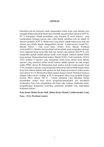 Penelitian kali ini bertujuan untuk menganalisis beban kerja yang dialami serta mengidentifikasi penyebab beban kerja berlebih yang dirasakan operatori di PT X. PT X merupakan sebuah perusahaan yang bergerak di sector industry yang memproduksi berbagai macam jenis roller.Subjek penelitian kali ini adalah 16 operator produksi di PT X. Beban kerja yang diukur adalah beban kerja fisik dan mental yang diolah dengan menggunakan metode Cardiovascular Load(CVL), Metode NASA – Task Load Index (NASA TLX), Metode Workload Analysis(WLA). Manfaat dari penelitian kali ini adalah untuk mengetahui seberapa besar tingkatan beban kerja baik fisik dan mental yang dialami oleh PT X serta mengetahui apakah jumlah pekerja sudah sesuai dengan standard optimal beban kerja operator. Berdasarkan hasil analisis Metode NASA- Task Load Index (NASA TLX) terdapat 9 operator yang mengalami beban kerja mental berat dimana operator yang menerima beban mental terberat adalah operator las titik dengan indeks WWL sebesar 80. Berdasarkan hasil analisis metode Cardiovascular Load (CVL) terdapat 2 operator yang mengalami beban kerja fisik berlebih dengan beban kerja fisik terberat dialami oleh operator las titik dengan persentase Cardiovascular load sebesar 43.5 %.Berdasarkan Hasil analisis dengan metode Workload Analysis didapati bahwa divisi welding di PT X mengalami beban kerja berlebih dengan besaran WLA sebesar 108 % . Usulan perbaikan yang diberikan berupa penambahan tenaga kerja divisi pengelasan,penempatan job description berdasarkan factor usia, penambahan alat bantu suhu ruangan, pemberian music, pengembangan departemen konseling, pemberian pelatihan serta menerapkan kebijakan rekreasi Kata kunci: Beban Kerja Fisik, Beban Kerja Mental, Cardiovascular Load, Nasa – TLX, Workload Analysis