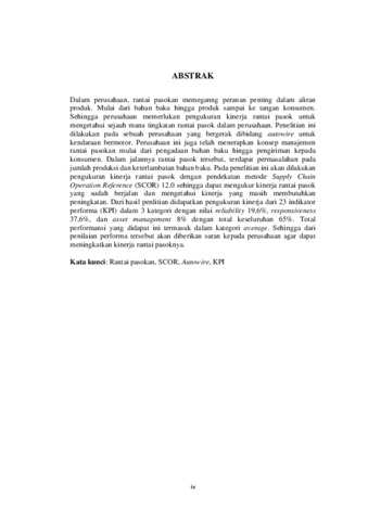 Dalam perusahaan, rantai pasokan memeganng peranan penting dalam aliran produk. Mulai dari bahan baku hingga produk sampai ke tangan konsumen. Sehingga perusahaan memerlukan pengukuran kinerja rantai pasok untuk mengetahui sejauh mana tingkatan rantai pasok dalam perusahaan. Penelitian ini dilakukan pada sebuah perusahaan yang bergerak dibidang autowire untuk kendaraan bermotor. Perusahaan ini juga telah menerapkan konsep manajemen rantai pasokan mulai dari pengadaan bahan baku hingga pengiriman kepada konsumen. Dalam jalannya rantai pasok tersebut, terdapat permasalahan pada jumlah produksi dan keterlambatan bahan baku. Pada penelitian ini akan dilakukan pengukuran kinerja rantai pasok dengan pendekatan metode Supply Chain Operation Reference (SCOR) 12.0 sehingga dapat mengukur kinerja rantai pasok yang sudah berjalan dan mengetahui kinerja yang masih membutuhkan peningkatan. Dari hasil penlitian didapatkan pengukuran kinerja dari 23 indikator performa (KPI) dalam 3 kategori dengan nilai reliability 19,6%, responsiveness 37,6%, dan asset management 8% dengan total keseluruhan 65%. Total performansi yang didapat ini termasuk dalam kategori average. Sehingga dari penilaian performa tersebut akan diberikan saran kepada perusahaan agar dapat meningkatkan kinerja rantai pasoknya. Kata kunci: Rantai pasokan, SCOR, Autowire, KPI