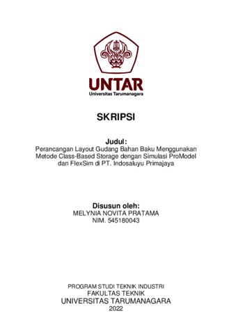 Pratama, Melynia Novita (2022) Perancangan layout gudang bahan baku menggunakan metode class-based storage dengan simulasi promodel dan flexsim di PT. Indosaluyu Primajaya (T. Ind - 721). Skripsi thesis, Universitas Tarumanagara.