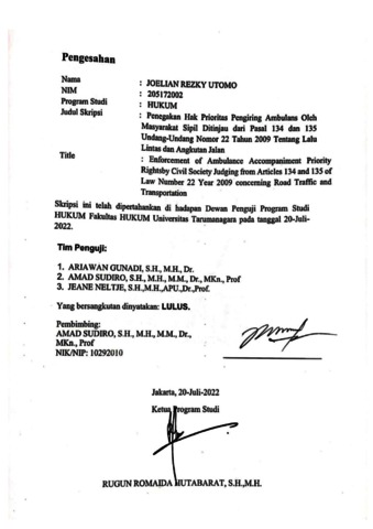 Utomo, Joelian Rezky (2022) Penegakan Hak Prioritas Pengiring Ambulans oleh Masyarakat Sipil Ditinjau dari Pasal 134 dan 135 Undang-Undang Nomor 22 Tahun 2009 Tentang Lalu Lintas dan Angkutan Jalan. Skripsi thesis, Universitas Tarumanagara.