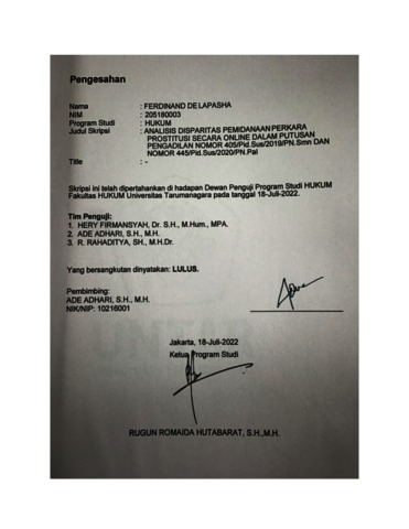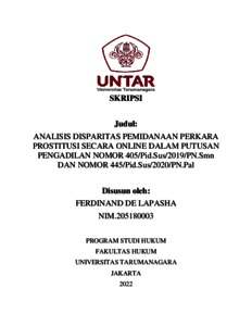 Ferdinand, De Lapasha (2022) Analisis Disparitas Pemidanaan Perkara Prostitusi Secara Online Dalam Putusan Pengadilan Nomor 405/Pid.Sus/2019/PN.Smn DAN NOMOR 445/Pid.Sus/2020/PN.Pal. Skripsi thesis, Universitas Tarumanagara.