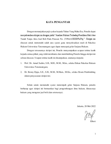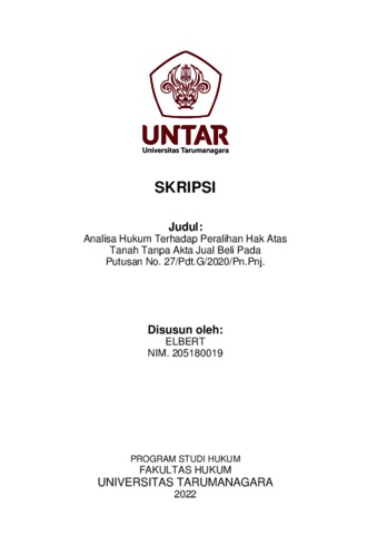 Elbert, Elbert (2022) Analisa Hukum Terhadap Peralihan Hak Atas Tanah Tanpa Akta Jual Beli Pada Putusan No. 27/Pdt.G/2020/Pn.Pnj. Skripsi thesis, Universitas Tarumanagara.