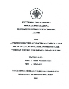 Halim Putera S, tesis (2004) Analisis Porfolio yang optimal atas dua puluh saham unggulan yang berkapitalisasi pasar terbesar di bursa efek jakarta pada tahun 2004. Masters thesis, Universitas Tarumanagara.