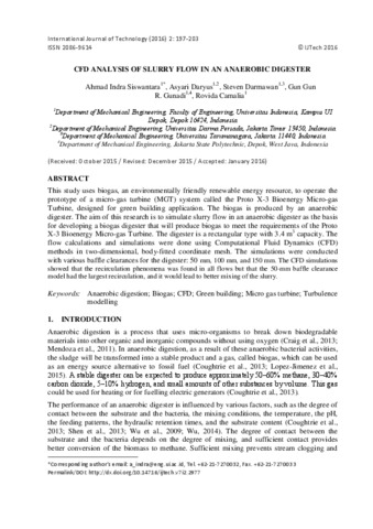 Darmawan, Steven (2016) CFD ANALYSIS OF SLURRY FLOW IN AN ANAEROBIC DIGESTER. International Journal of Technology. ISSN 2086-9614
