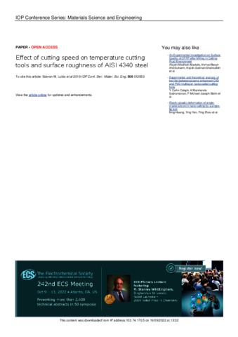 Darmawan, Steven Effect of cutting speed on temperature cutting tools and surface roughness of AISI 4340 steel. IOP Conference Series: Materials Science and Engineering.