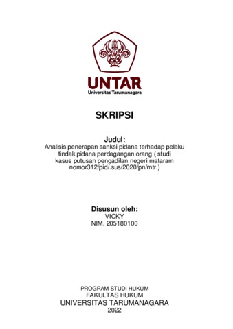 Vicky, Vicky (2022) Analisis Penerapan Sanksi Pidana Terhadap Pelaku Tindak Pidana Perdagangan Orang (Studi Kasus Putusan Pengadilan Negeri Mataran Nomor 312/Pid.Sus/2020/PN.Mtr.). Skripsi thesis, Universitas Tarumanagara.